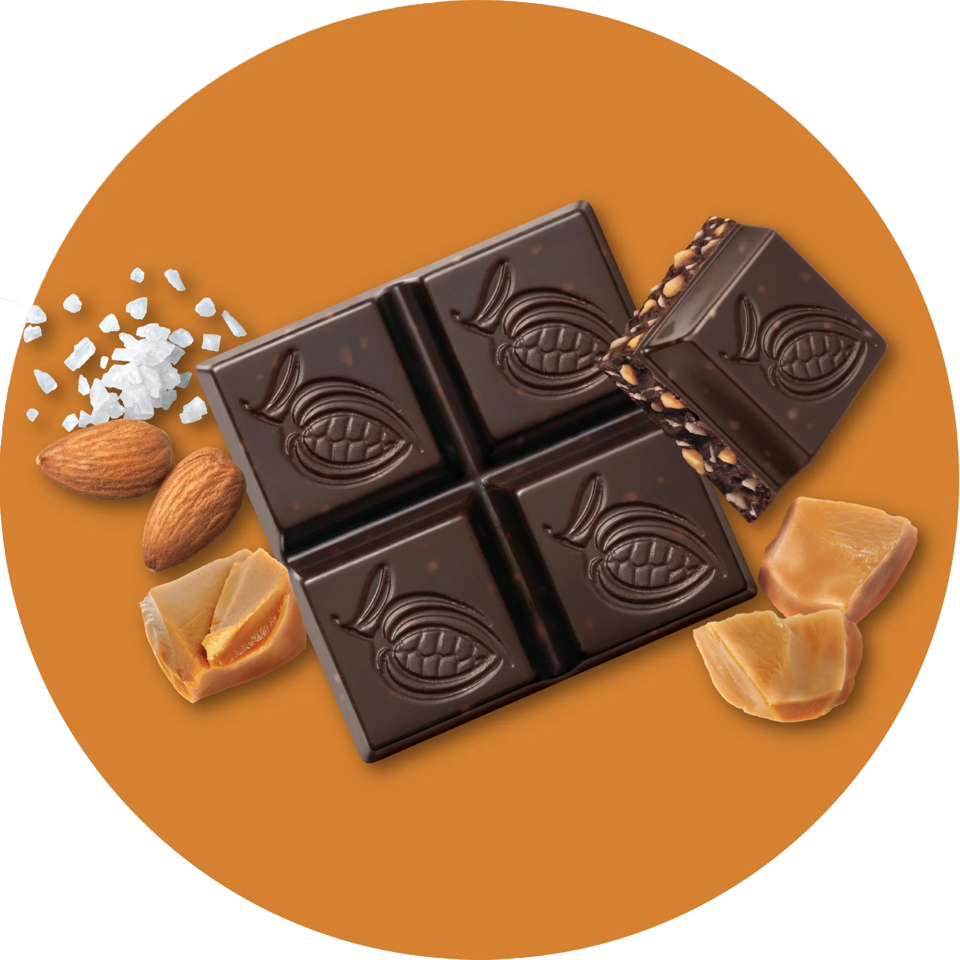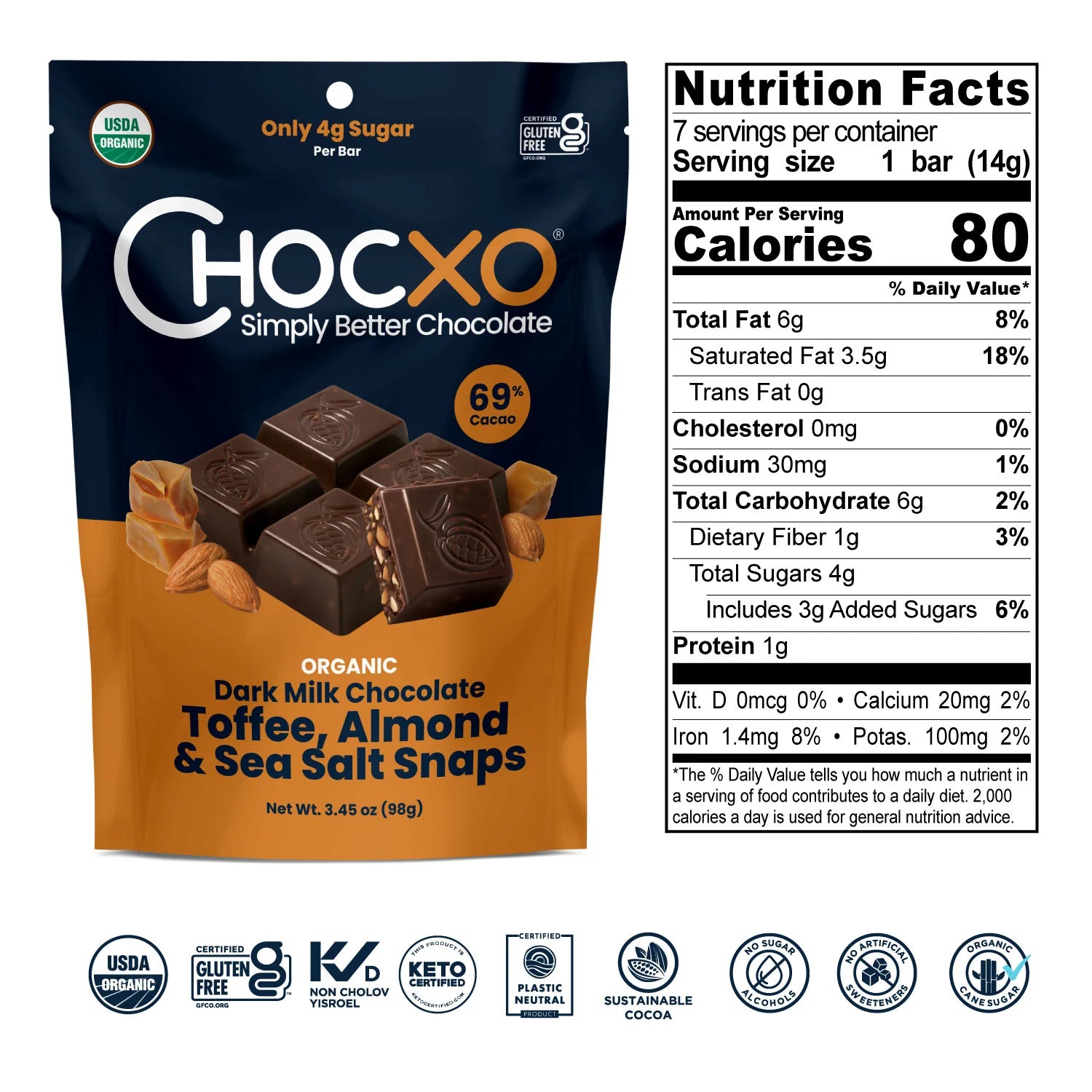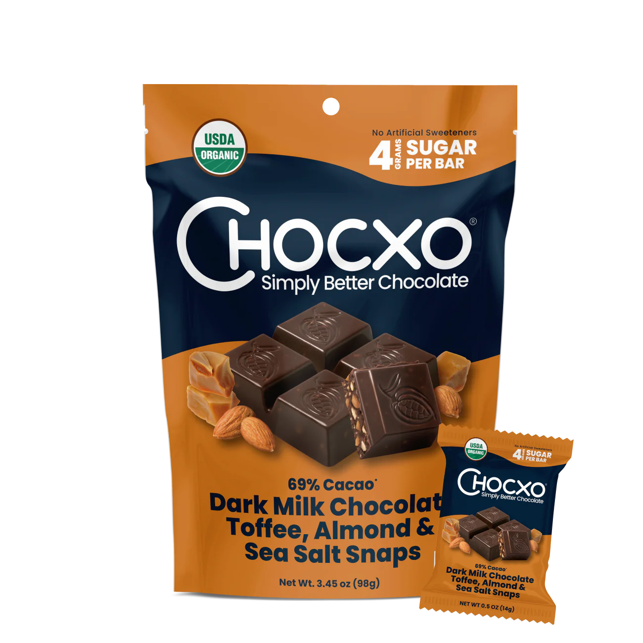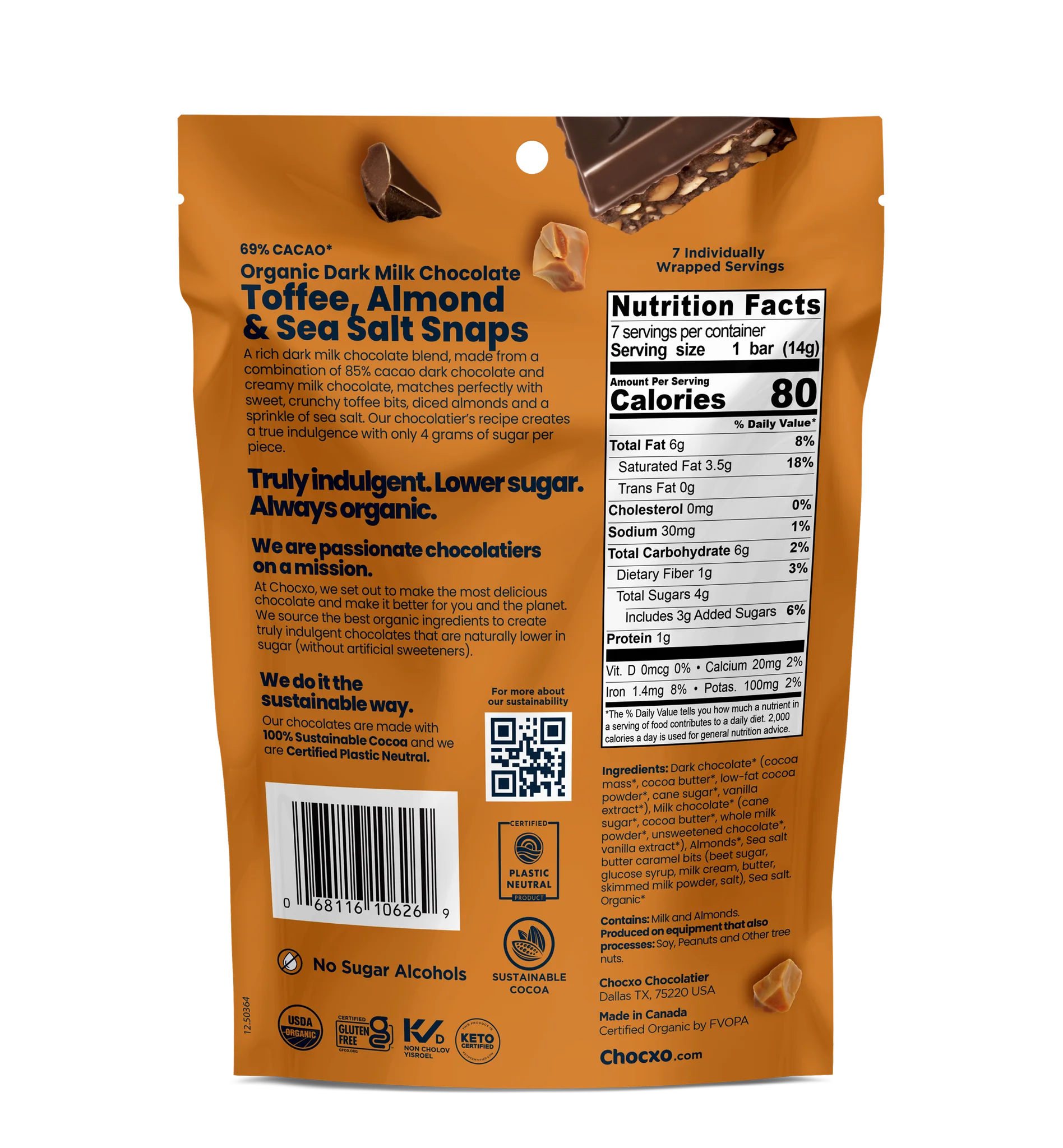 Made form combining 85% dark chocolate with creamy milk chocolate, these new Snaps are perfectly sprinkled with butter toffee bits, roasted almonds and a dash of sea salt. A uniquely delicious snap-able indulgence for only 4 grams of sugar per mini bar.