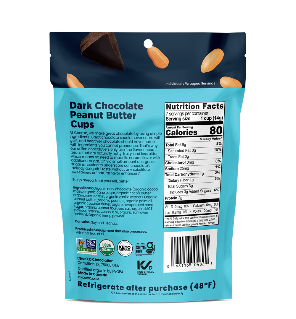 Ingredients: Organic dark chocolate (organic cocoa mass, organic cane sugar, organic cocoa butter, organic soy lecithin, organic vanilla extract), Organic peanut butter (organic peanuts, organic palm oil, organic coconut butter, organic evaporated cane sugar, organic peanut flour, sea salt, organic MCT powder, organic coconut oil, organic sunflower lecithin), Organic hemp powder.