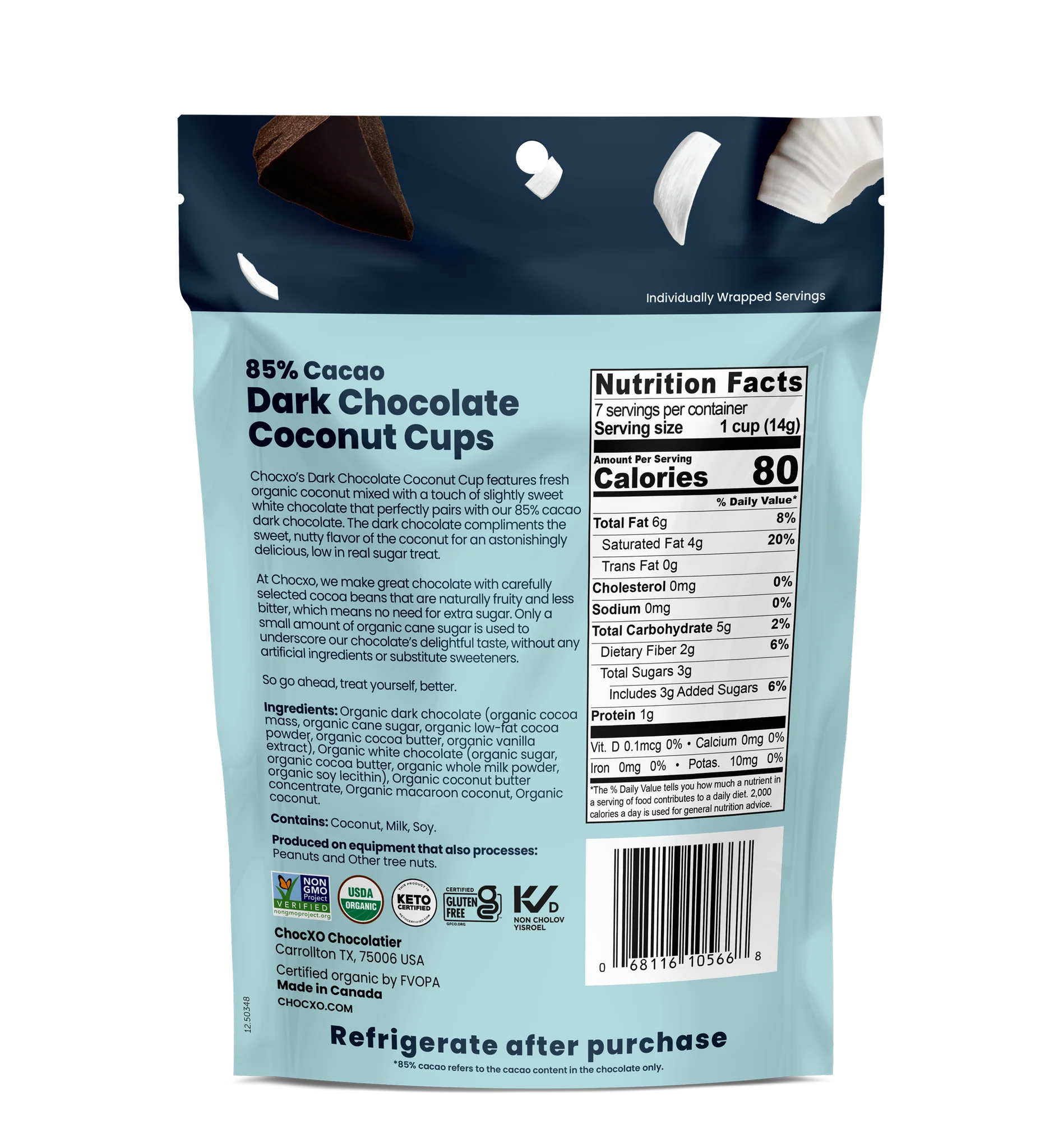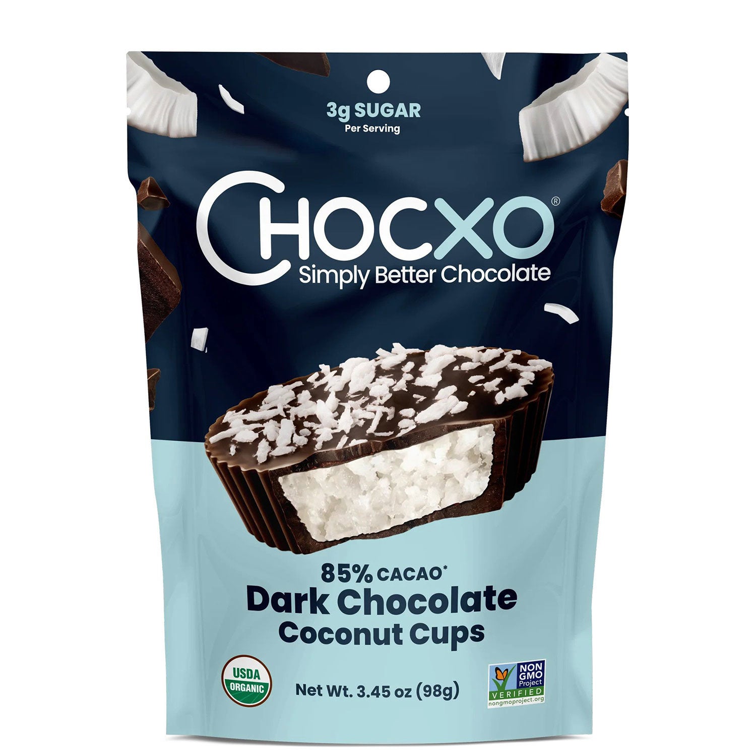 Meet Dark Chocolate Coconut Cups, the newest addition to the Chocxo portfolio and a delightful combo of organic coconut, white chocolate and a rich 85% dark chocolate shell. With just 3 grams of sugar per cup, this new cup on the block will leave you delightfully satisfied.