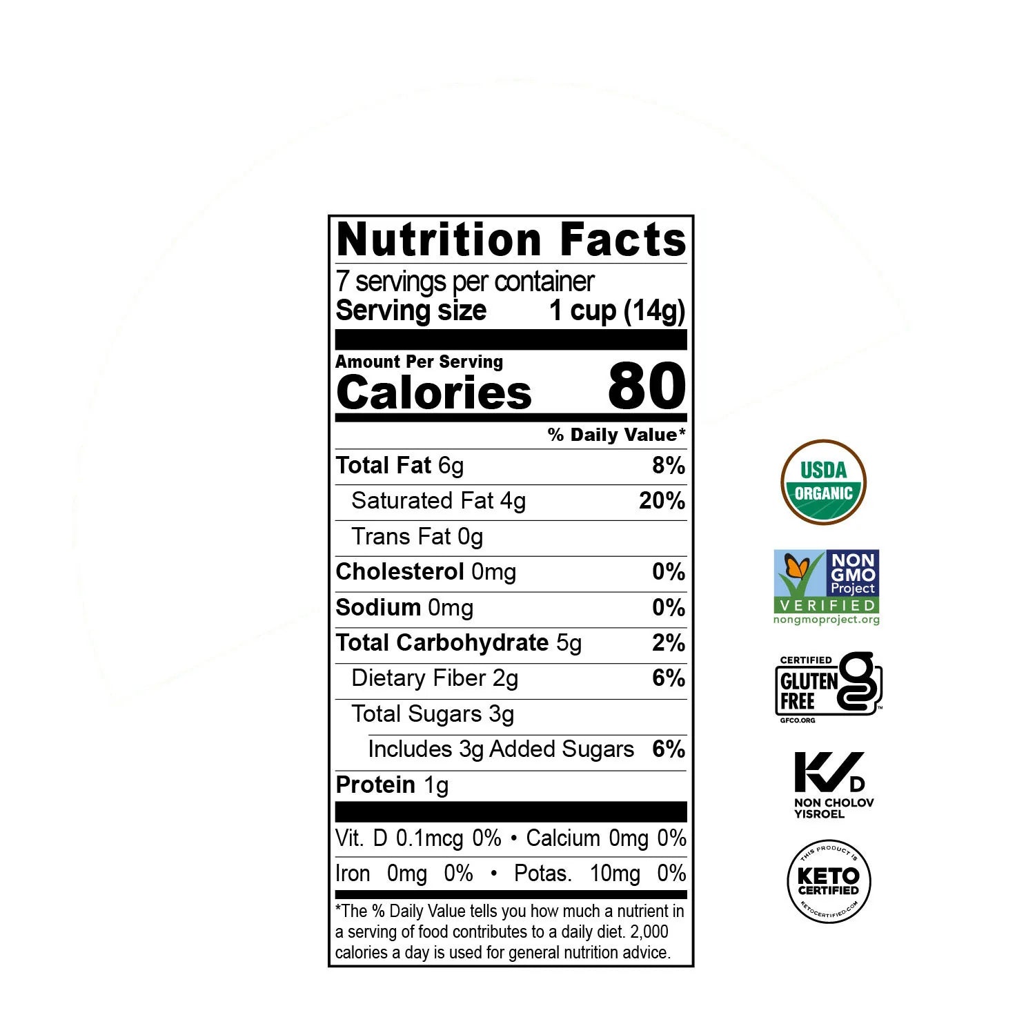 Ingredients: Organic dark chocolate (organic cocoa mass, organic cane sugar, organic low-fat cocoa powder, organic cocoa butter, organic vanilla extract), Organic white chocolate (organic sugar, organic cocoa butter, organic whole milk powder, organic soy lecithin), Organic coconut butter concentrate, Organic macaroon coconut, Organic coconut.