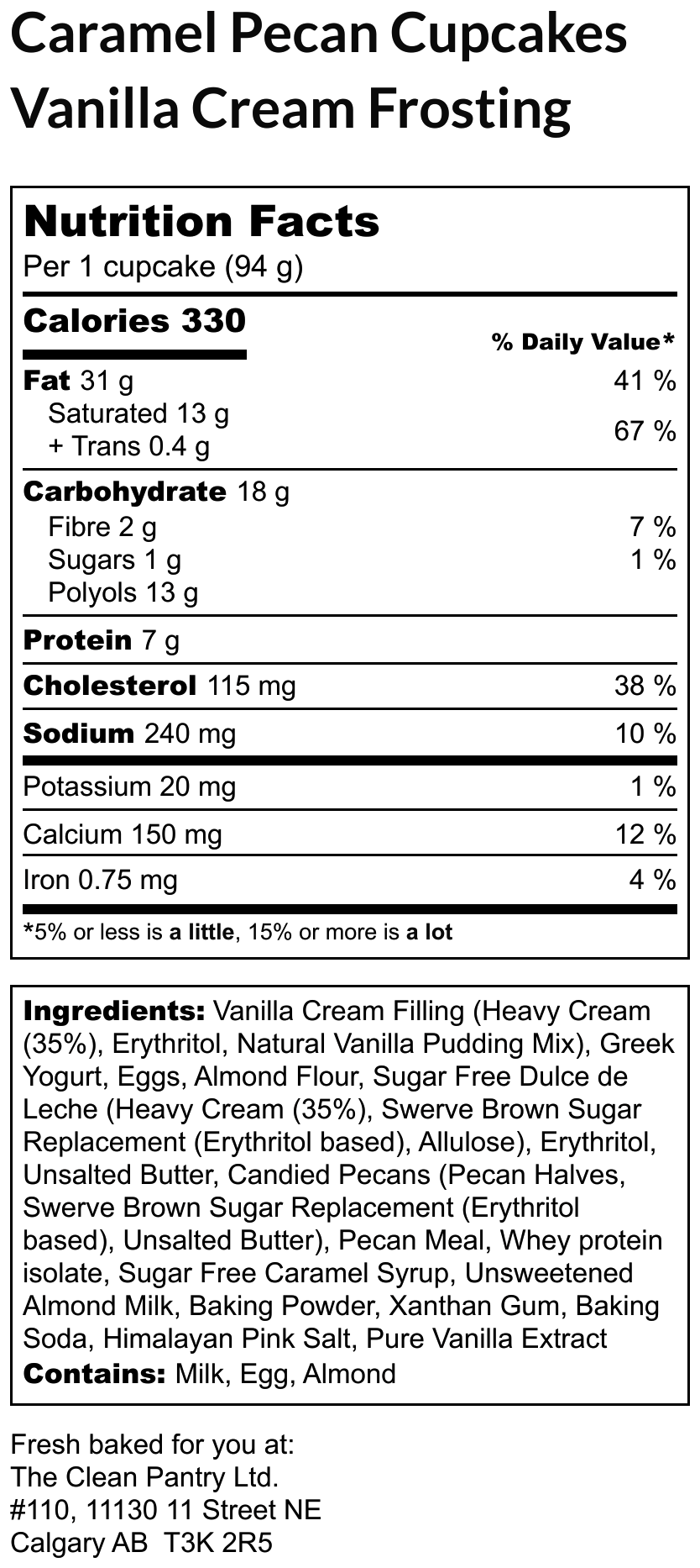 Vanilla Pecan Cupcakes with a hint of Caramel, topped with a Vanilla Cream frosting, a drizzle of Caramel Rum & Butter sauce and Candied Pecans