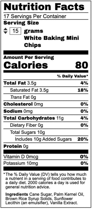 Our new white baking chips are made in a nut free and gluten free facility. While dairy and soy are present elsewhere in the facility, this product is made on a dairy-free and soy-free line with ingredient testing to ensure strict allergen controls.