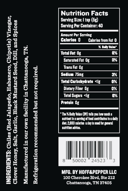 Ingredients: Chiles (Red Jalapeño, Habanero, Chipotle) Vinegar, Clover Honey, Salt, Garlic, Black Mustard Seed, Dill, and Spices