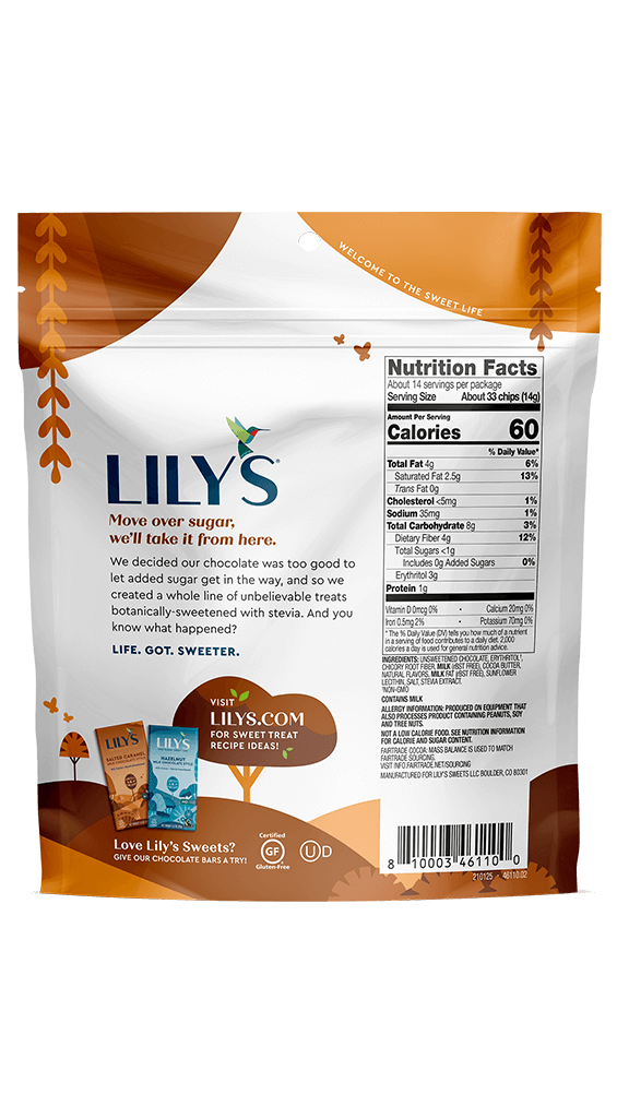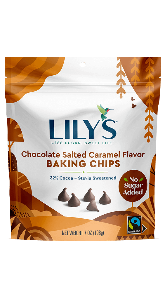 Salty and sweet: a marriage of two flavors that you can't deny will last a lifetime. Lily’s Chocolate Salted Caramel Flavor Baking Chips are the perfect addition to whatever sweets you're whipping up. And as a snack, these chips satisfy two cravings at once. What more could you ask for? Less Sugar. Sweet Life.