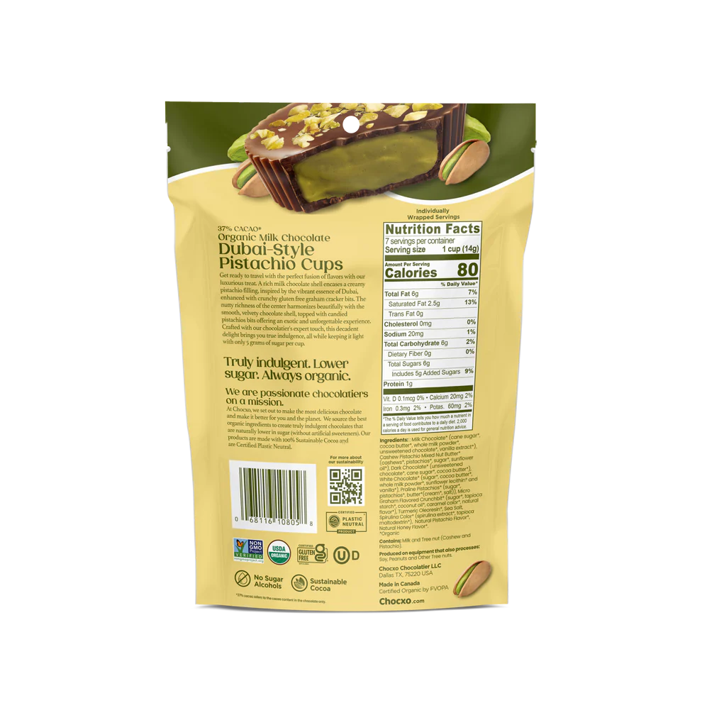 Introducing the new Chocxo Dubai Style Pistachio Cups. Inspired by the global viral trend, these cups feature a creamy milk chocolate shell filled with premium pistachio nut butter. Topped with crunchy pistachio pieces and with only 5 grams of sugar per cup.