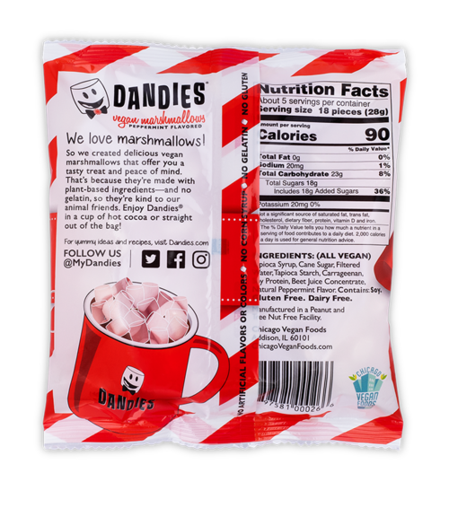 Dandies® Peppermint Marshmallows are made with no artificial flavours or colours, no corn syrup, no gelatin, and no gluten. Our marshmallows are kosher and made with non-gmo ingredients.