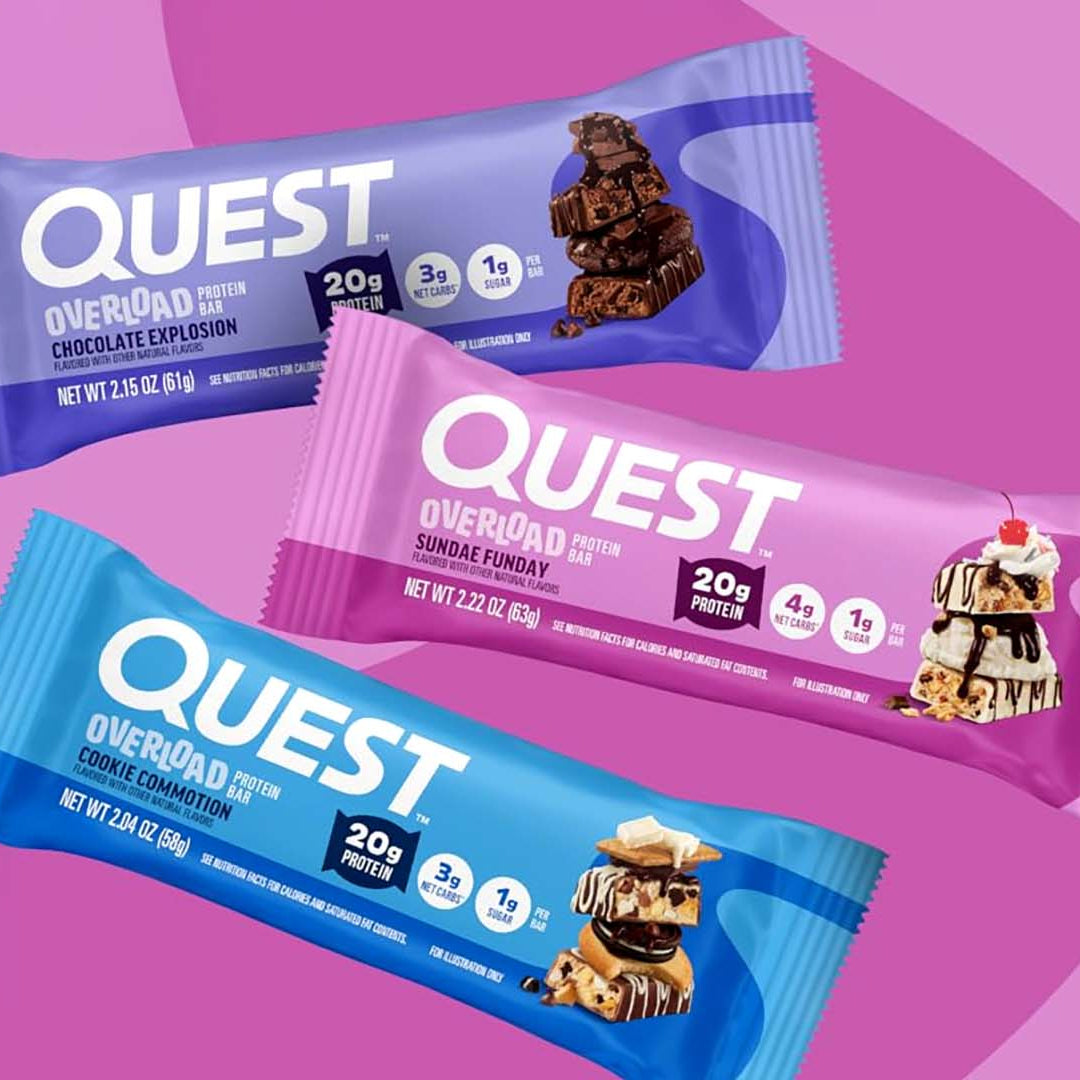 Cheat on basic snacks with protein hacks. New Quest™ Overload Protein Bars are covered, delightfully drizzled, and packed with more of the chunks, chips & pieces you love – and less of the sugar you don’t.
