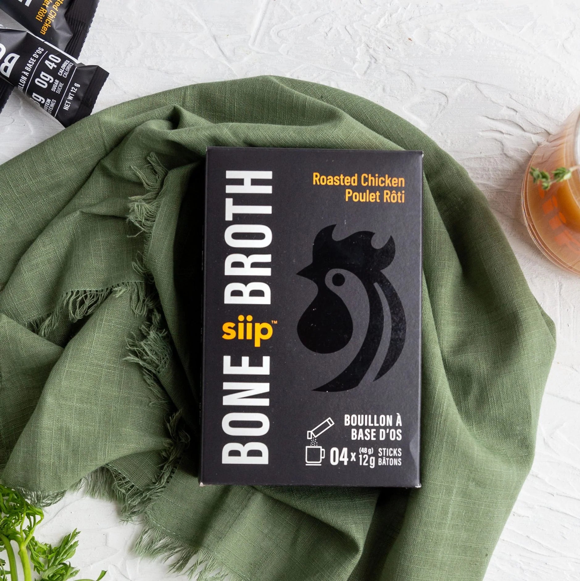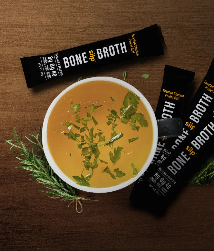 Savoury roasted chicken bone broth powder in convenient single-serve stick packs. Open a packet; add 250ml of boiling water, stir and Siip.