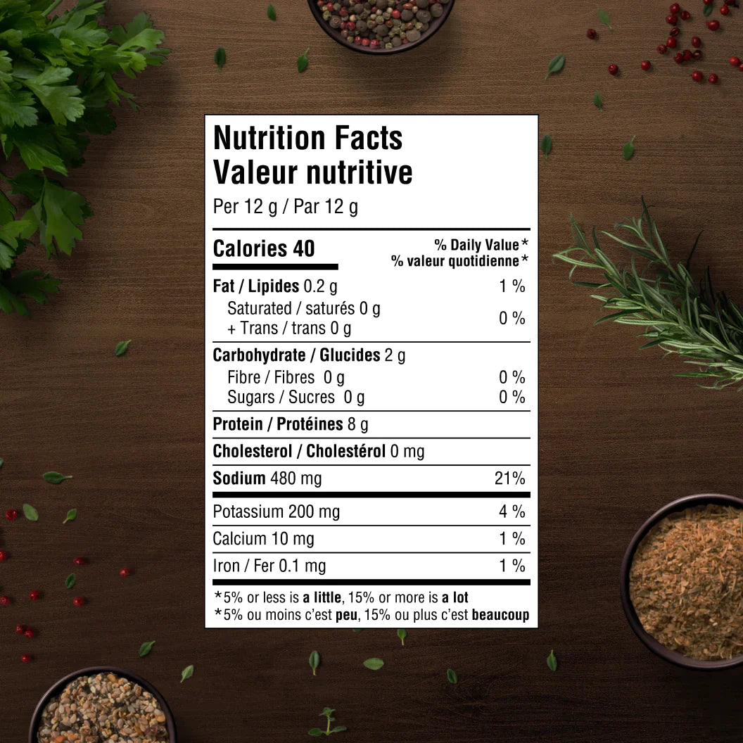 Ingredients: Dried Chicken Bone Broth, Natural Flavours, Yeast Extract, Sea Salt, Silicon Dioxide, Spices. Made in Canada with domestic and imported ingredients.