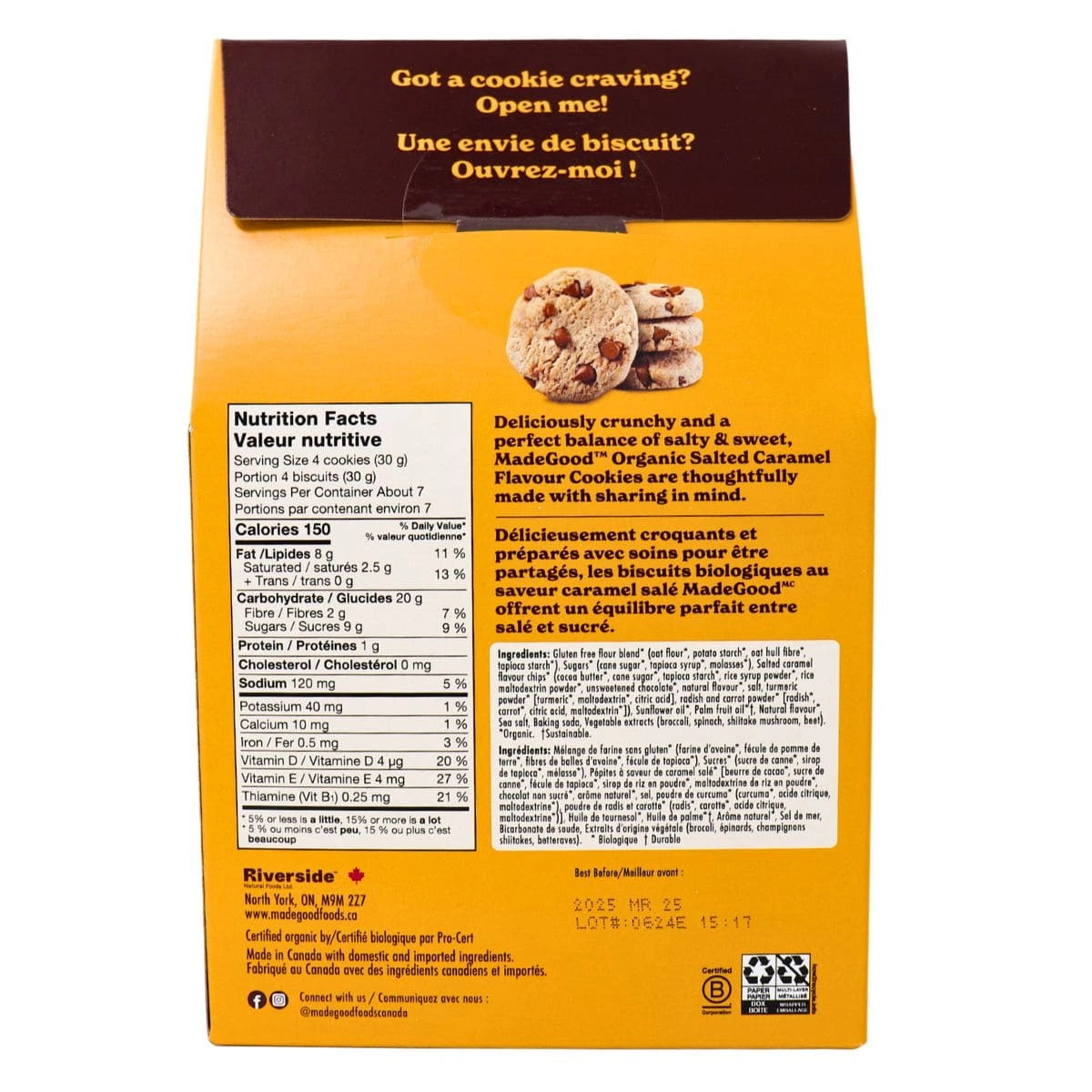 Indulge with MadeGood's Salted Caramel Cookies, the better-for-you treat designed for sharing moments of delight! With an improved texture and deliciously crunchy bite, these tasty cookies boast enhanced flavour and are crafted in a dedicated nut-free facility.