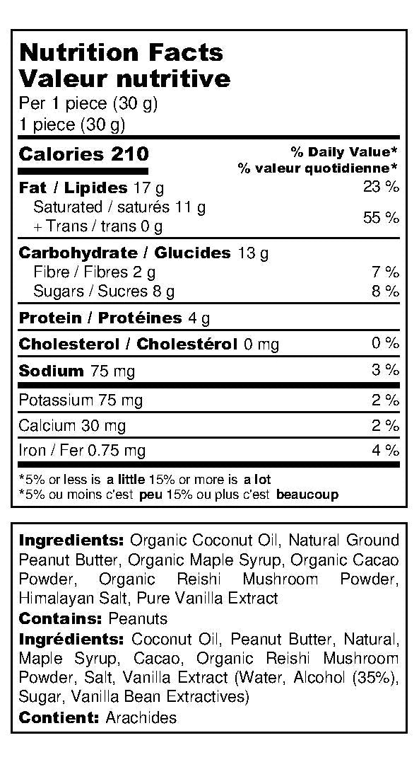 Ingredients: Organic Cacao, Organic Coconut Oil, Peanuts, Organic Reishi Mushroom Powder, Organic Maple Syrup, Organic Himalayan Salt, Pure Vanilla Extract.