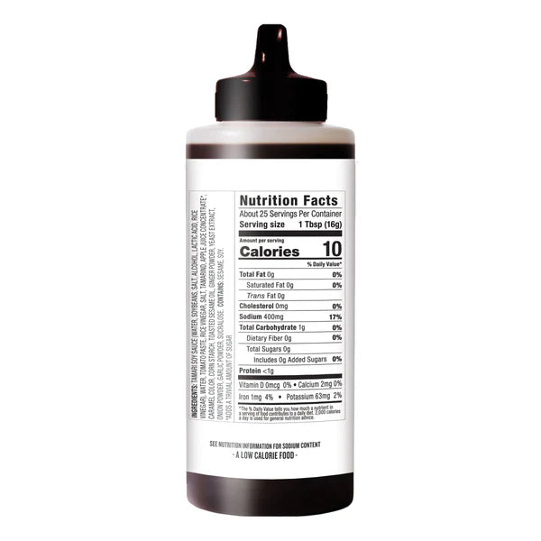 Ingredients: Tamari Soy Sauce (Water, Soybeans, Salt, Alcohol, Lactic Acid, Rice Vinegar), Water, Tomato Paste, Rice Vingegar, Salt, Tamarind, Apple Juice Concentrate*, Caramel Colour, Corn Starch, Toasted Sesame Oil, Ginger Powder, Yeast Extract, Onion Powder, Garlic Powder, Sucralose