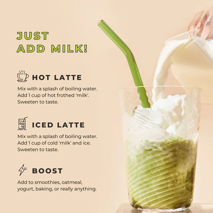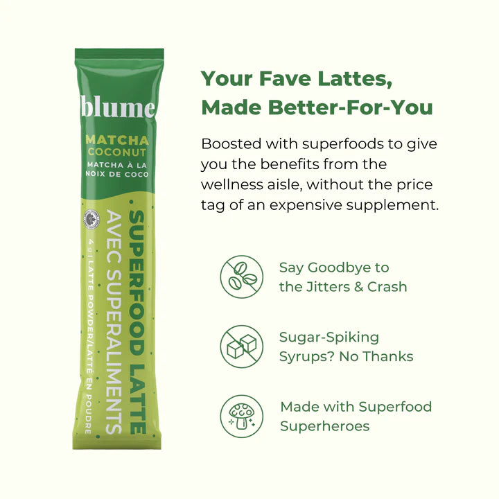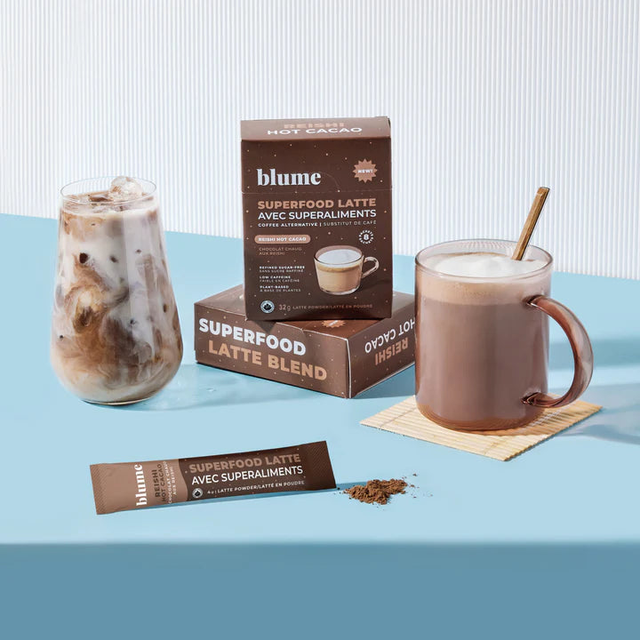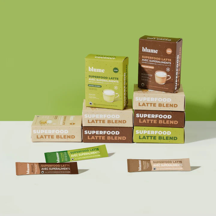 HOT LATTE: Mix one packet of the Blume powder with a splash of boiling water. Sweeten to taste (we like maple syrup). Top with your favourite warm, frothed mylk and enjoy!